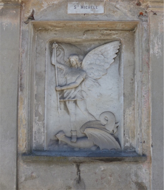 The beautifully carved slab, probably of late 19th century date, shows St Michael, winged, dressed in a short light tunic and ankle-length footwear with open toes; he holds the spear firmly in his hands with the point downwards, destined to pierce the winged dragon that the archangel holds firmly under his right foot. The sculptural representation of this monstrous animal perhaps does not do justice to its satanic ferocity.