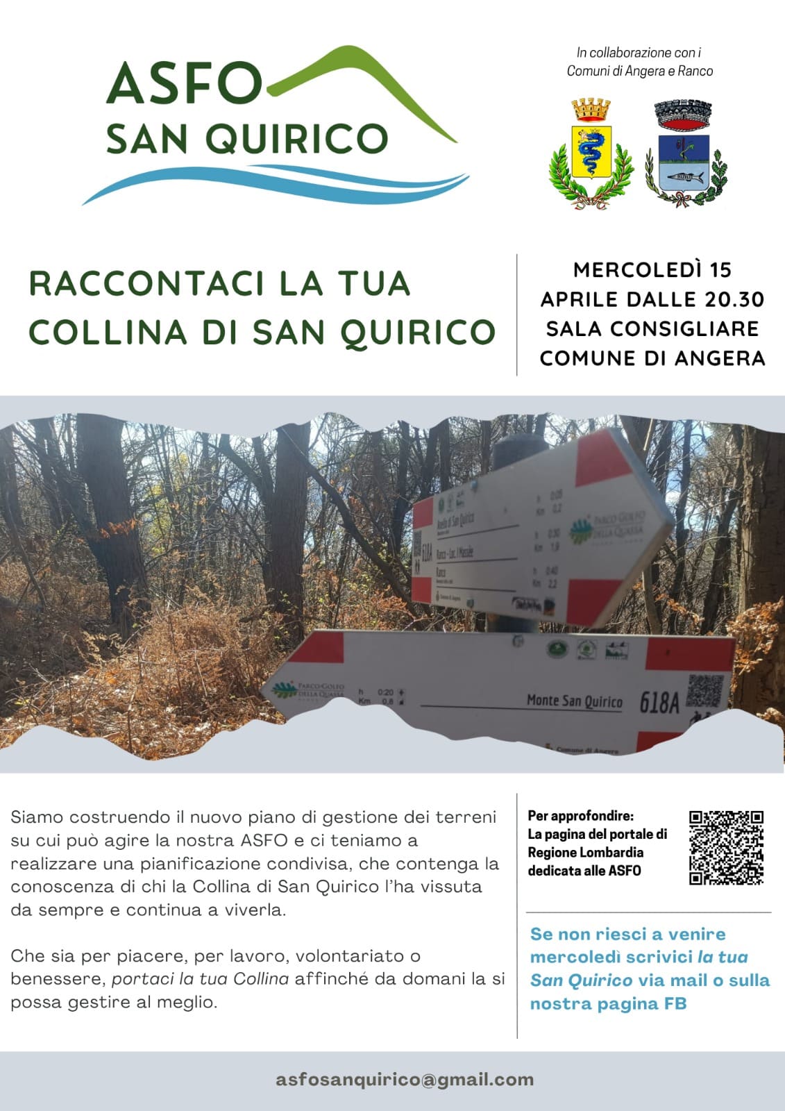 Incontro di ASFO San Quirico in collaborazione con i Comuni di Angera e Ranco per raccogliere ricordi, impressioni attuali ed immaginare insieme il futuro della collina, amata da cittadini e visitatori, con lo scopo di redigere un  piano di gestione forestale che garantisca una migliore gestione.