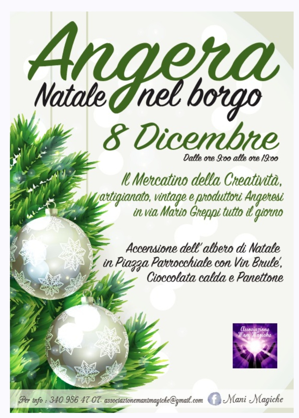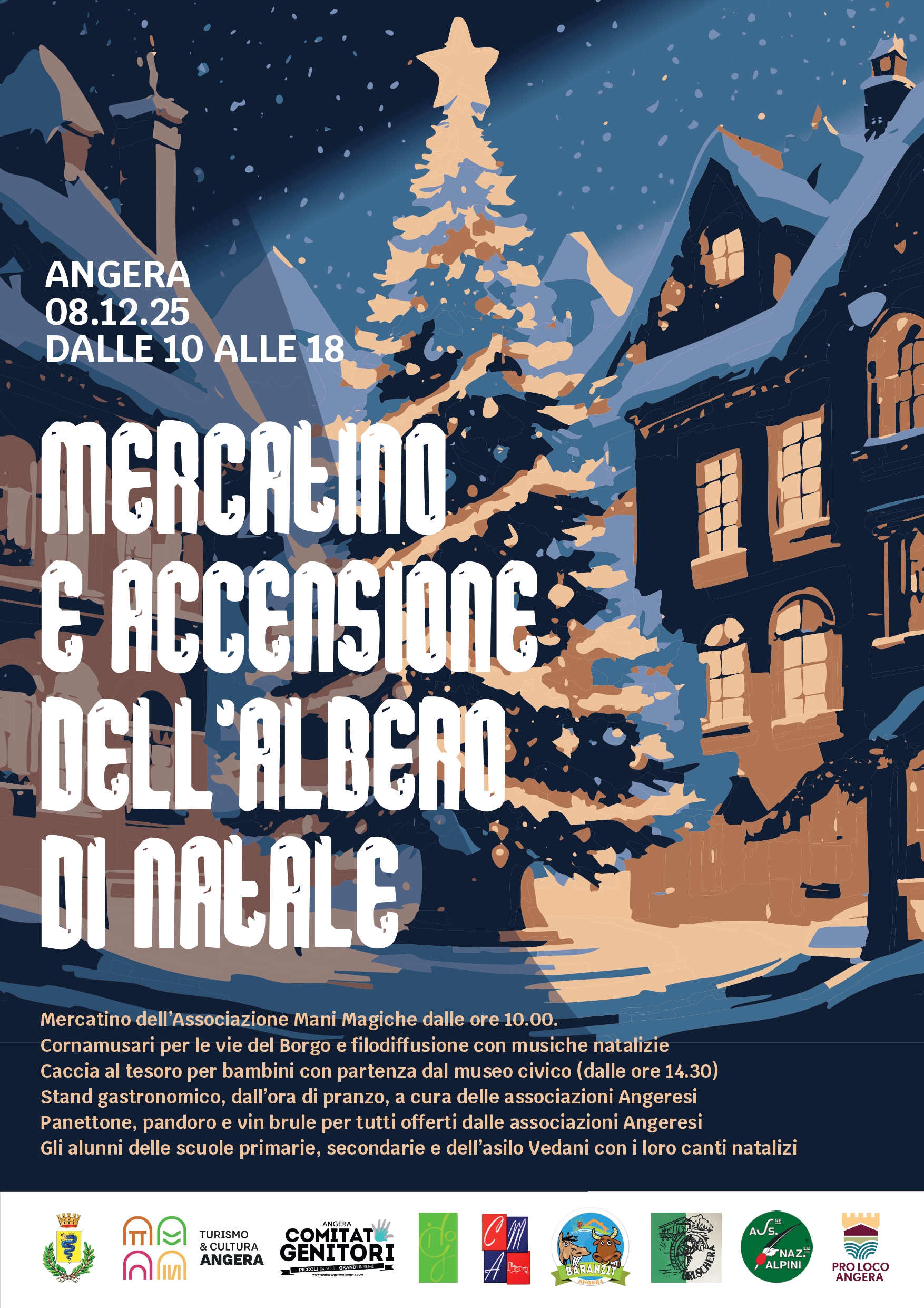 Per la Festa dell'Immacolata potremo assistere, nel cuore del Borgo, alla tradizionale accensione dell'albero, ascoltare i canti dei bambini e le musiche dei cornamusari. Troveremo il mercatino dell'Associazione Mani Magiche, un'allegra caccia al tesoro per famiglie organizzata dal Museo Archeologico, diversi stand gastronomici e leccornie offerte dalle associazioni Angeresi.