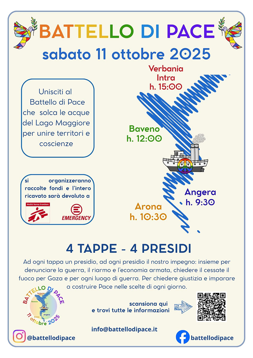 Il battello salperà dal porto di Angera alle ore 9.30, dando avvio a un viaggio partecipato che toccherà quattro tappe: Angera, Arona, Baveno e Intra. In ogni città si terranno eventi pubblici di sensibilizzazione con musica dal vivo, letture teatrali, testimonianze e riflessioni sul tema della pace.