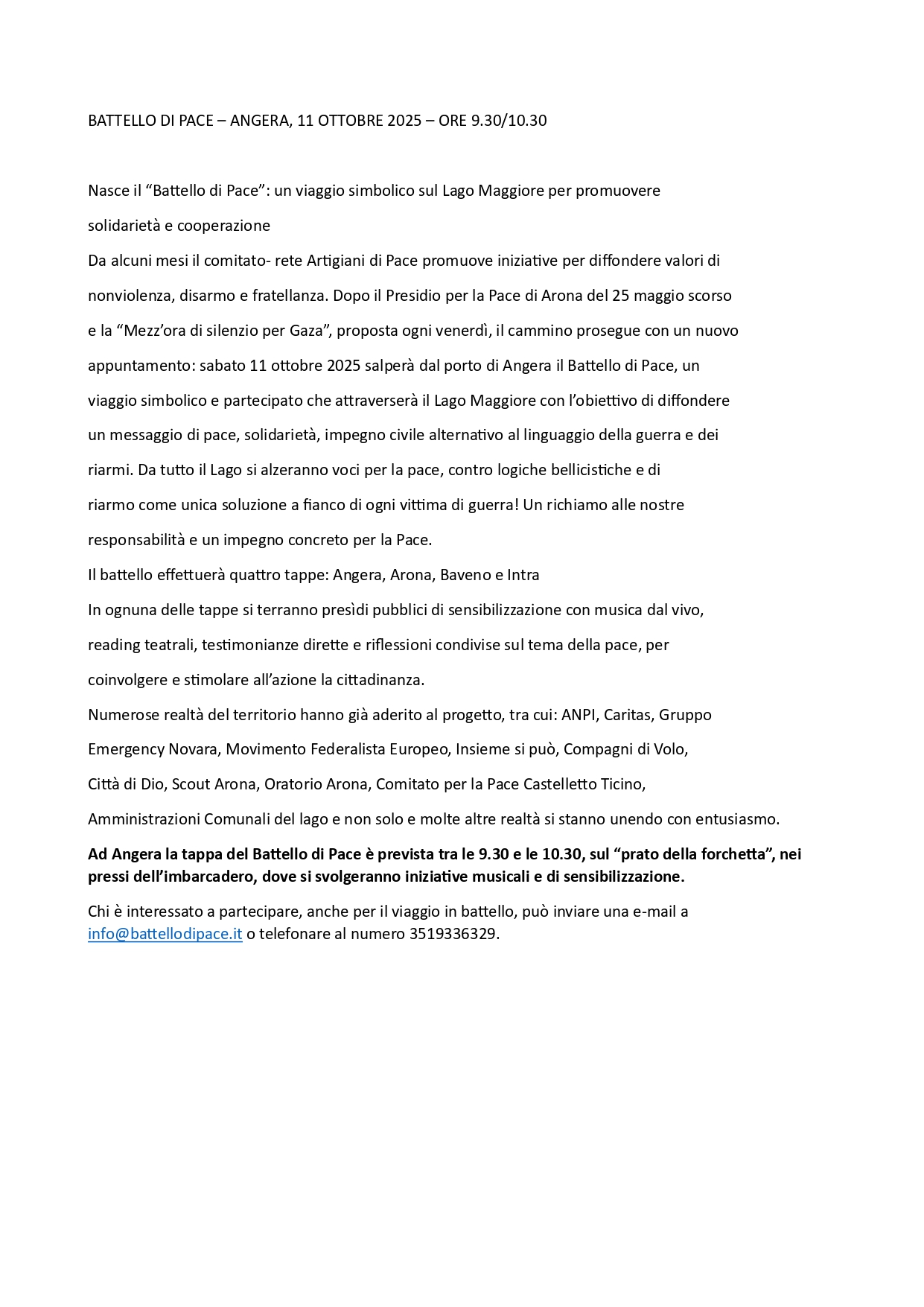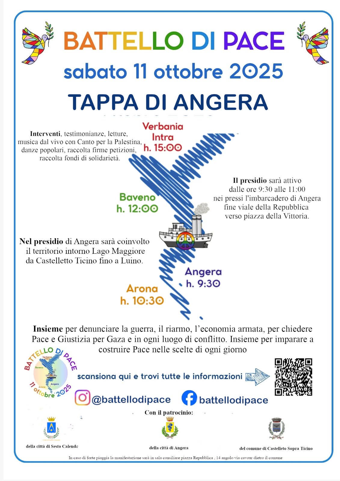 Sabato 11 ottobre 2025, Angera sarà il punto di partenza del “Battello di Pace”, un’iniziativa simbolica sul Lago Maggiore promossa dal comitato "Artigiani di Pace" per diffondere un messaggio di solidarietà, nonviolenza e cooperazione.