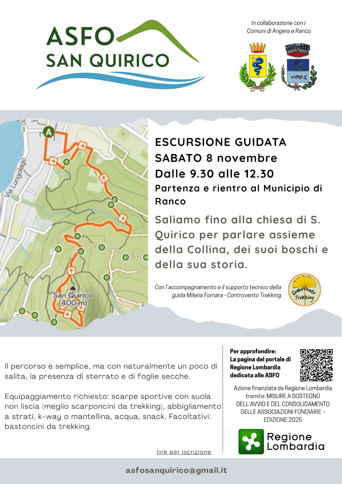 Possibilità di iscriversi all'escursione di ASFO San Quirico, accompagnata dalla guida Milena Fornara di Controvento Trekking, sulla collina di San Quirico. Partenza dal Municipio di Ranco.