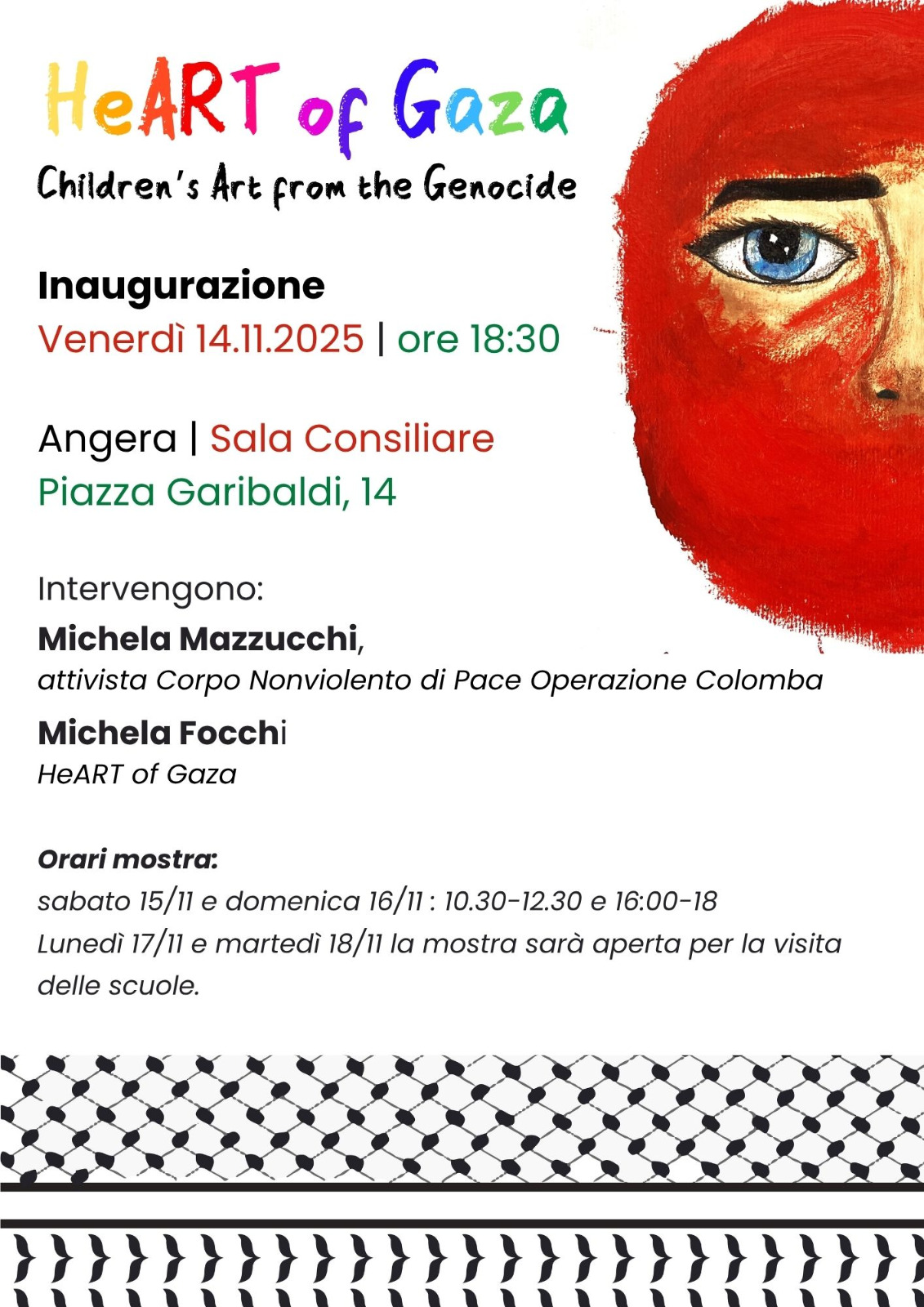 Venerdì 14 novembre alle 18.30 inaugura presso la Sala Consiliare del Comune di Angera, Heart of Gaza mostra di disegni realizzati dai bambini della Striscia. Obiettivo dell'iniziativa è passare dai bambini per arrivare all'umanità, sfidando la realtà attraverso gli occhi dei più piccoli. Interverranno Michela Mazzucchi, attivista Corpo Nonviolento di Pace Operazione Colomba e Michela Focchi HeART of Gaza.