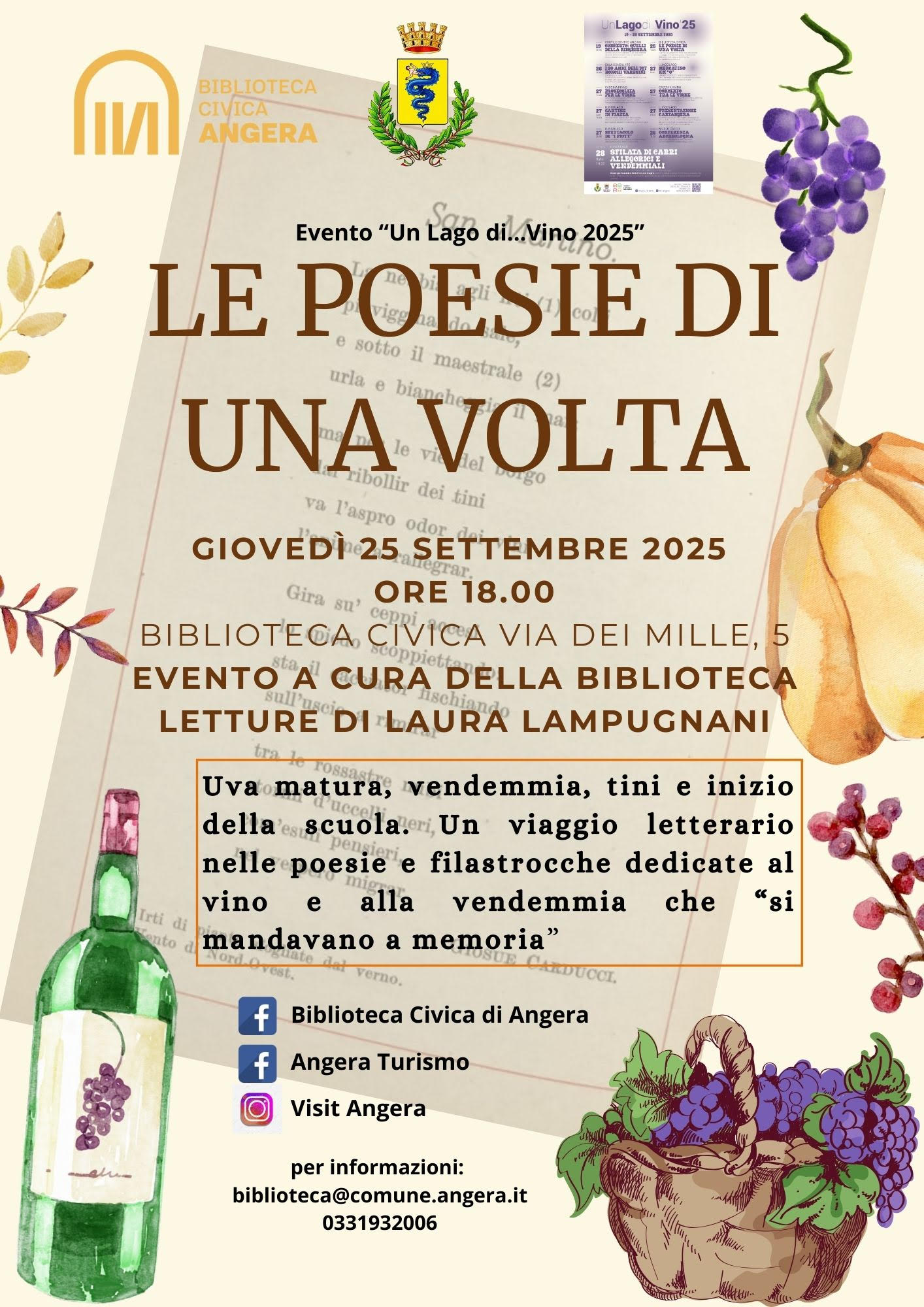 All'interno degli appuntamenti di "Un Lago di...Vino", giovedì 25 settembre 2025 alle ore 18.00, si terrà presso la Biblioteca Civica di Angera "Le Poesie di una volta", un evento aperto a tutti, grandi e piccini.