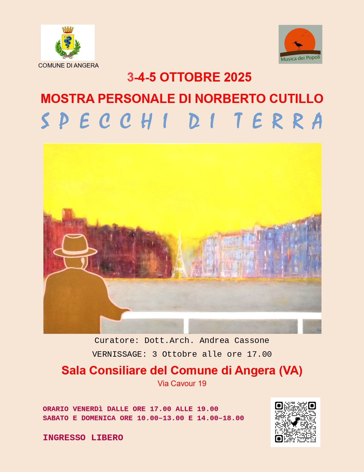 Dal 3 al 5 ottobre 2025, la Sala Consiliare del Comune di Angera ospiterà la mostra personale del pittore Norberto Cutillo, dal titolo “Specchi di Terra”.