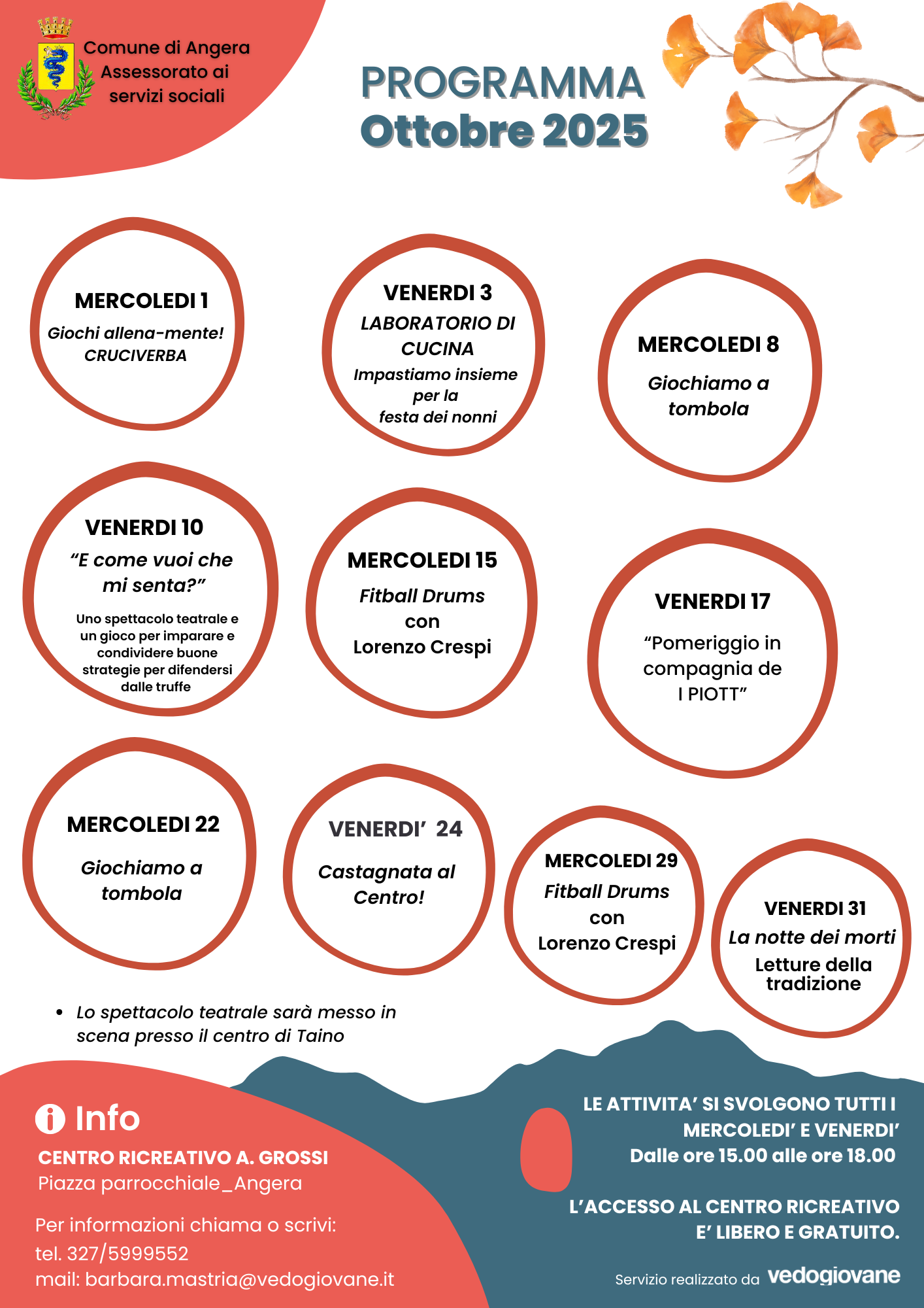Non mancano le attività anche per questo Ottobre al Centro Ricreativo Adamo Grossi; per chi vuole trascorrere tempo in compagnia pronta una serie di attività originali e divertenti.