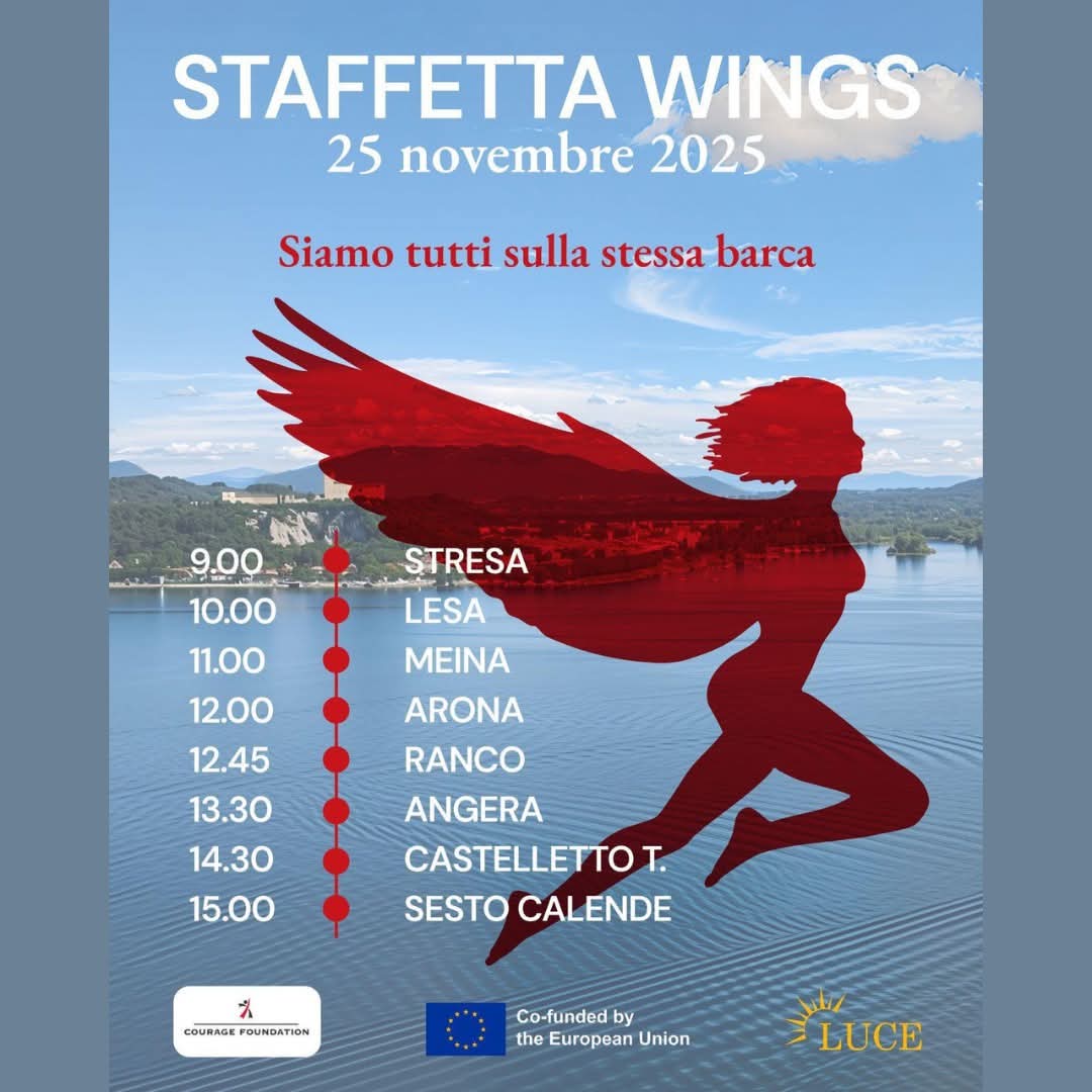 L' evento sportivo e culturale Staffetta Wings coinvolgerà i Comuni di Stresa, Lesa, Meina, Arona, Angera, Ranco, Sesto Calende, Castelletto Ticino. La partenza è prevista da Stresa alle ore 9:00, con arrivo ad Angera alle 13:30 e tappa finale nel pomeriggio a Sesto Calende. Itinerario completo in locandina. L’iniziativa libera è organizzata dalla Courage Foundation, che opera su Progetti cofinanziati da Erasmus + Programma dell'Unione Europea.