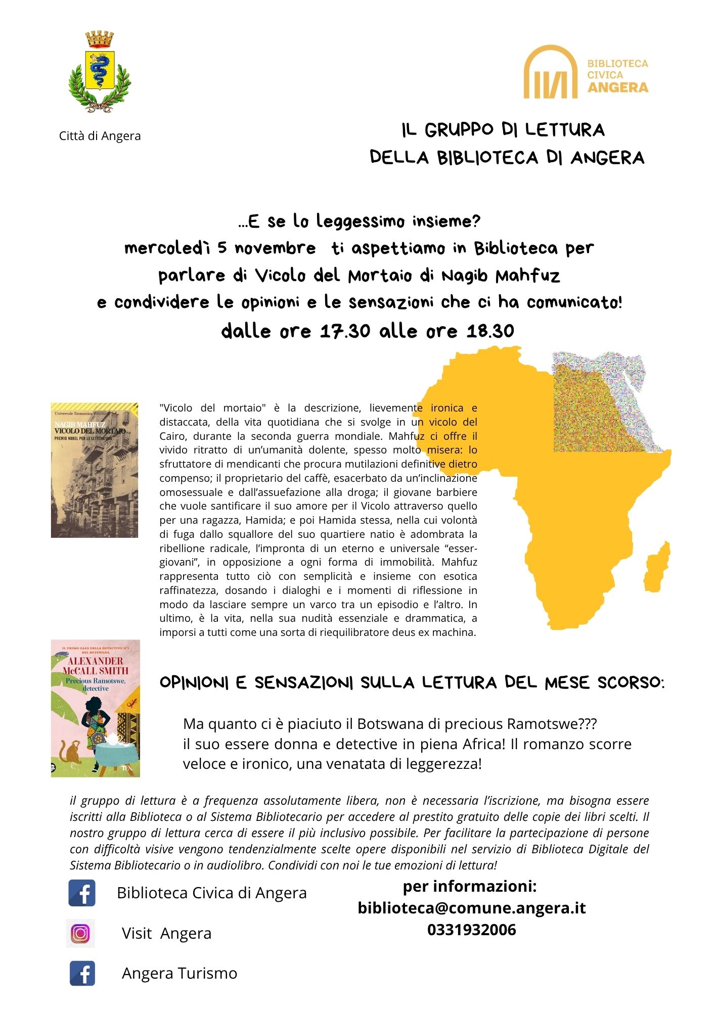 Durante il prossimo appuntamento del gruppo di lettura in biblioteca dicuteremo su "Vicolo del Mortaio" di Magib Mahfuz, volume pubblicato nel 1947, che offre una descrizione lievemente ironica e distaccata della vita quotidiana in un vicolo del Cairo durante la seconda guerra mondiale.