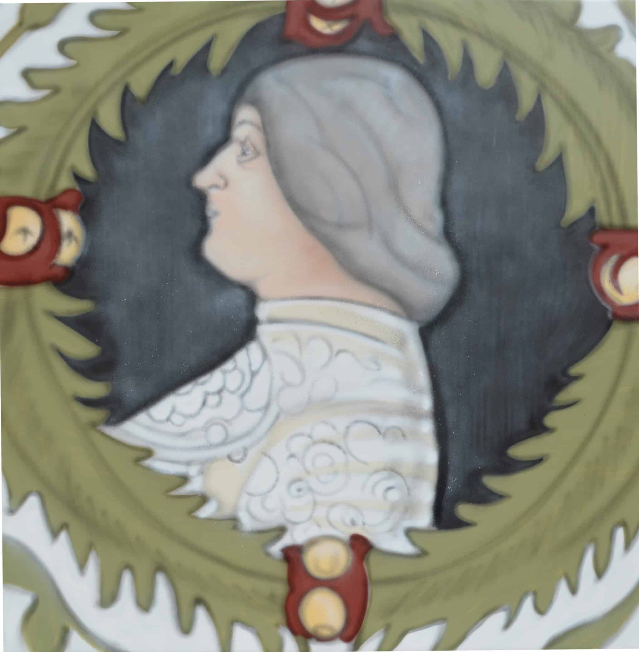 Particolare dell’affresco di Casa Forni raffigurante il ritratto con armatura di Ludovico Maria Sforza detto il Moro all’interno di una ghirlanda. Andrea Ravo Mattoni, 2019, bombolette spray su tela in pvc, 1,3 x 1,3 m. L’affresco è stato recentemente riscoperto e restaurato in occasione di lavori di ristrutturazione di Casa Forni, in Via Greppi, e non è accessibile al pubblico. Si trova in una sala del primo piano che presenta una decorazione su tutti e quattro i lati, nella parte sommitale della parete. Sono raffigurati, all’interno di ghirlande, ritratti di uomini e donne appartenenti a famiglie nobiliari del territorio, affiancati dai propri stemmi araldici, tra cui Castiglioni, Besozzi e Sforza; ad essi si aggiunge il ritratto dell’imperatore romano Nerva, forse da associare ad alcune leggende legate alla famiglia Sforza. Tra i ritratti è possibile riconoscere Francesco I Sforza, Bianca Maria Visconti e Ludovico Maria Sforza, detto il Moro. L’analisi degli stemmi e dei ritratti suggerisce una datazione alla fine del 1400, appena prima della caduta di Ludovico il Moro nel 1499. Sotto i ritratti e gli scudi la decorazione è completata da elementi vegetali uniti da nastri annodati, che sembrano richiamare gli affreschi realizzati da Leonardo da Vinci nella Sala delle Asse al Castello Sforzesco di Milano. L’ipotesi emersa dai primi studi, suggerisce che la casa possa essere appartenuta a Ettore Besozzi e Clara Castiglioni e che gli affreschi siano stati realizzati in occasione delle loro nozze. La presenza di stemmi e ritratti sforzeschi potrebbe indicare che l’edificio abbia anche ospitato il Capitano del Lago, un magistrato incaricato di controllare le sponde del Verbano per conto del duca di Milano. I possedimenti viscontei del lago, inclusa la Rocca di Angera, erano infatti passati nel 1447 alla Famiglia Borromeo. Ludovico il Moro cercò di recuperare il controllo del ducato sul Maggiore ponendo ad Angera il Capitaneato, nominandola città nel 1497 e quindi garantendo al borgo l’autonomia dai Borromeo: le città non potevano infatti essere infeudate. Il Moro concesse inoltre agli Angeresi la possibilità di svolgere mercato e due fiere annuali, una dedicata al bestiame, in primavera, e una in settembre per festeggiare la vendemmia, celebrata ancora oggi con sfilate di carri vendemmiali. Gli affreschi sono in corso di studio. Vedi sito n. 8 del Museo Diffuso di Angera – www.angera.it